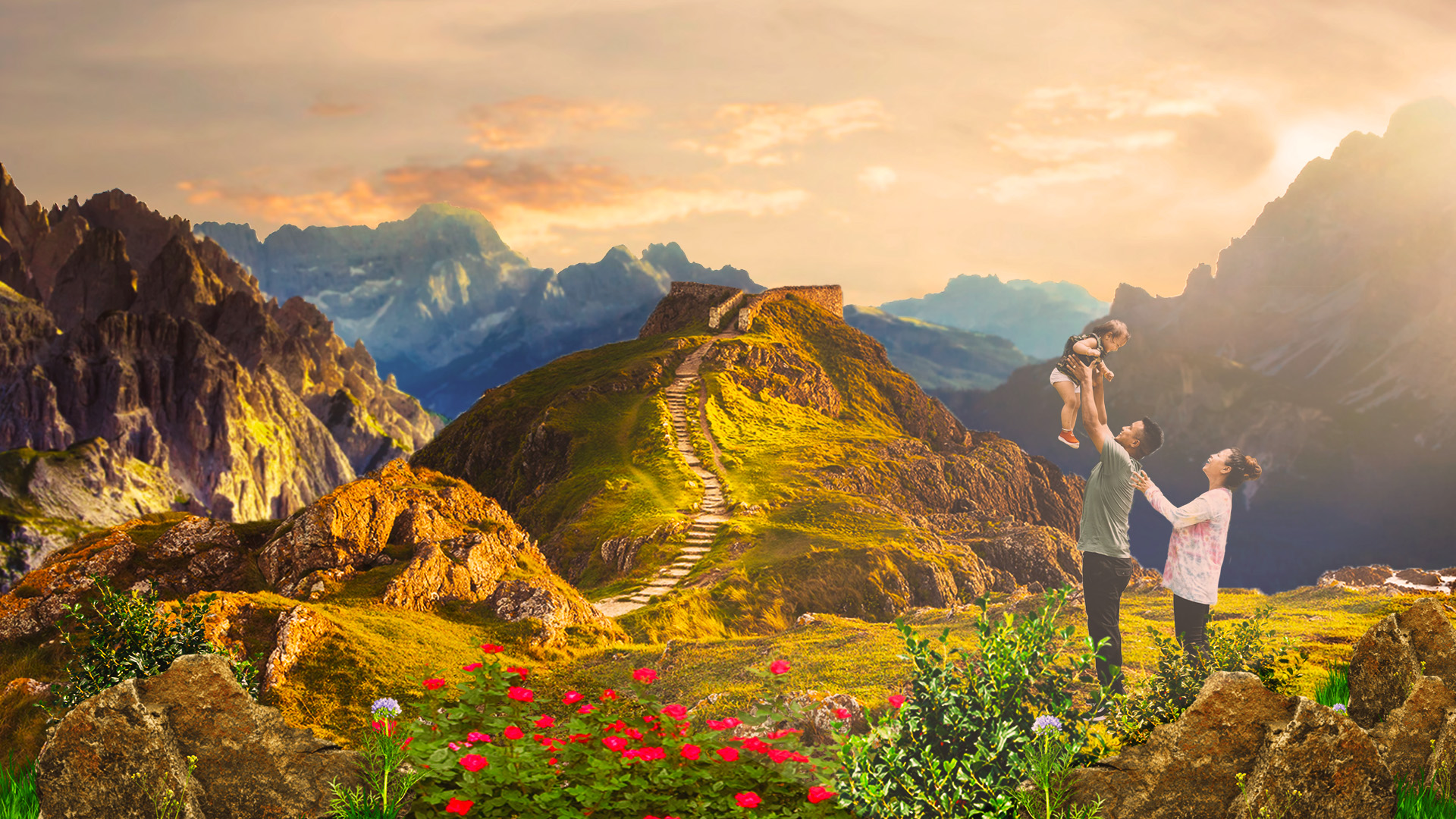 This matte painting, crafted in Adobe Photoshop, seamlessly combines world-building and atmospheric realism in a logically believable mountainous landscape scene, capturing the quiet wonder of an afternoon adventure. The scene was meticulously constructed through a layering of high-resolution references and advanced digital techniques. I layered multiple mountain range images against a sky image, establishing a sense of scale and vastness that feels grounded in reality prior to incorporating the plants and family. Using various Photoshop lighting and color-grading tools, I adjusted the scene to make it feel as believable as possible.
